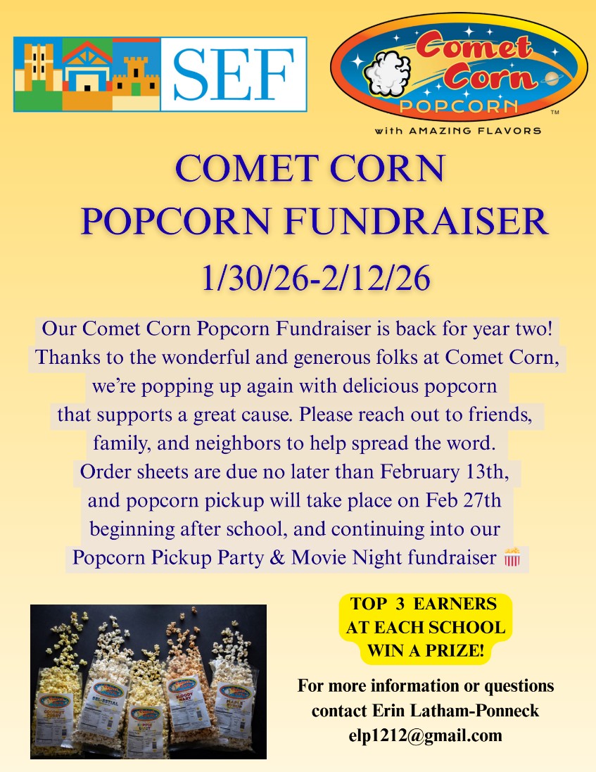 SEF has again teamed up with our local friends at Comet Corn Popcorn for our annual popcorn fundraiser. Comet Corn offers a variety of different flavors of yummy popcorn!